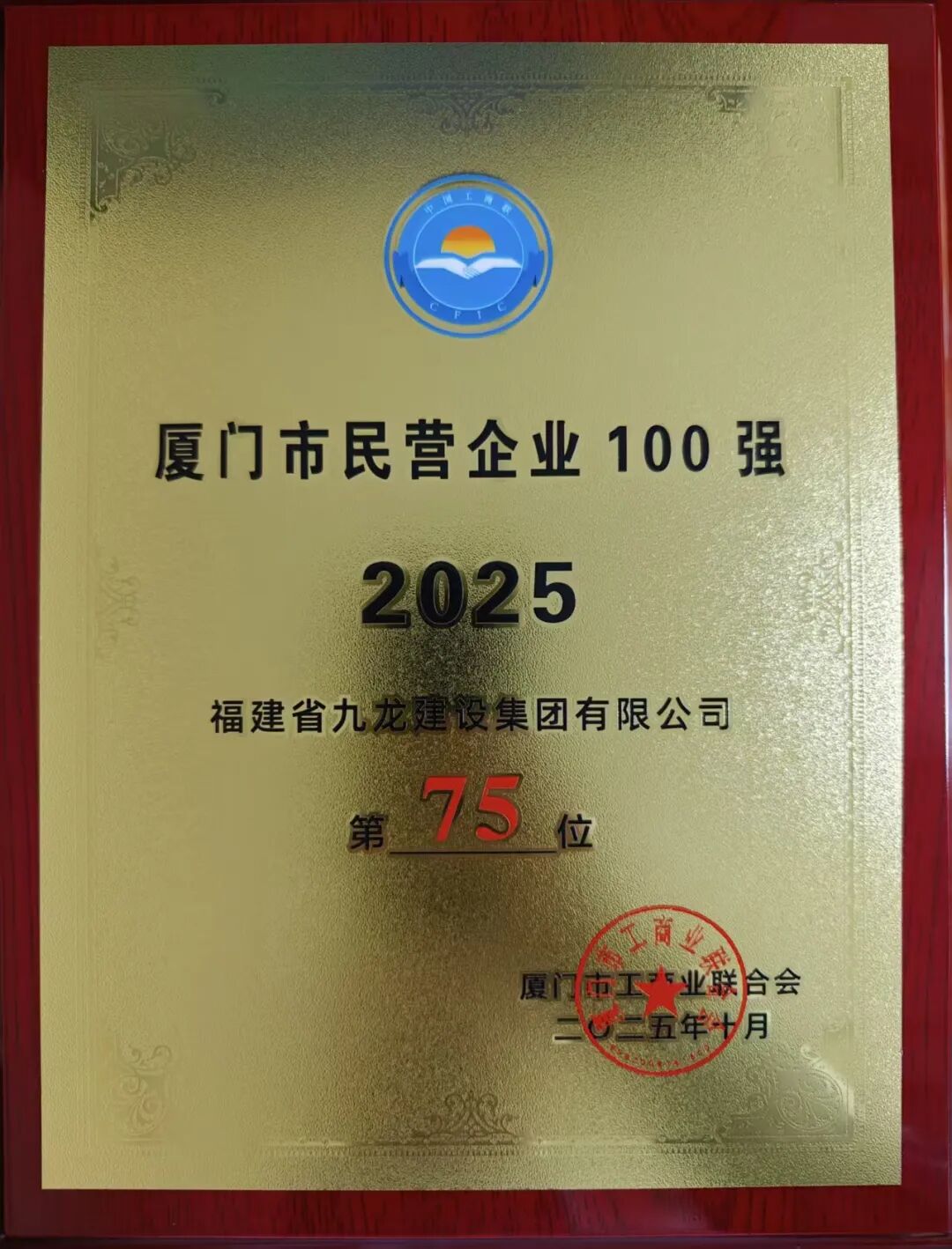 我司福建省九龙建设集团有限公司,再次上榜,获评2025厦门市民营企业100强第75位。