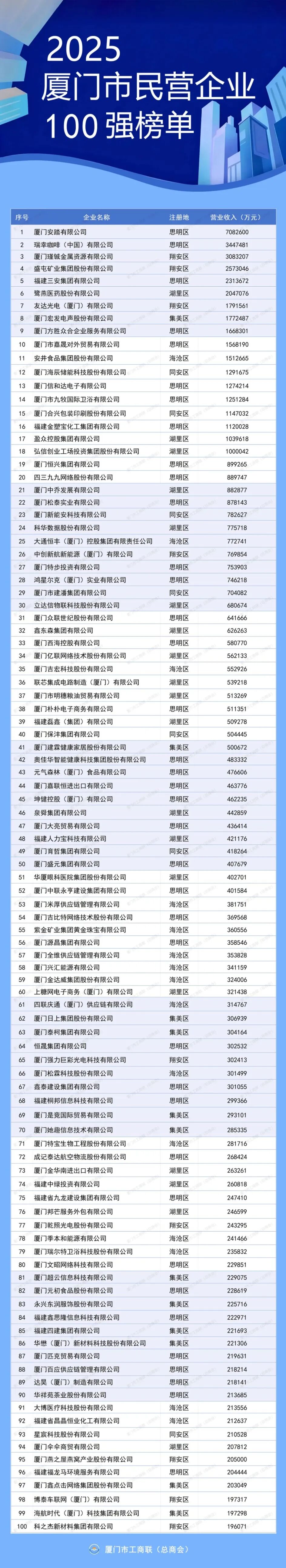厦门市工商联依托全国工商联调研体系,联合厦门大学经济学院进行数据分析,形成2025厦门市民营企业100强调研分析报告。根据调研,以2024年营收排序评出“2025厦门市民营企业100强”和“制造业50强”、“服务业50强”等系列榜单。