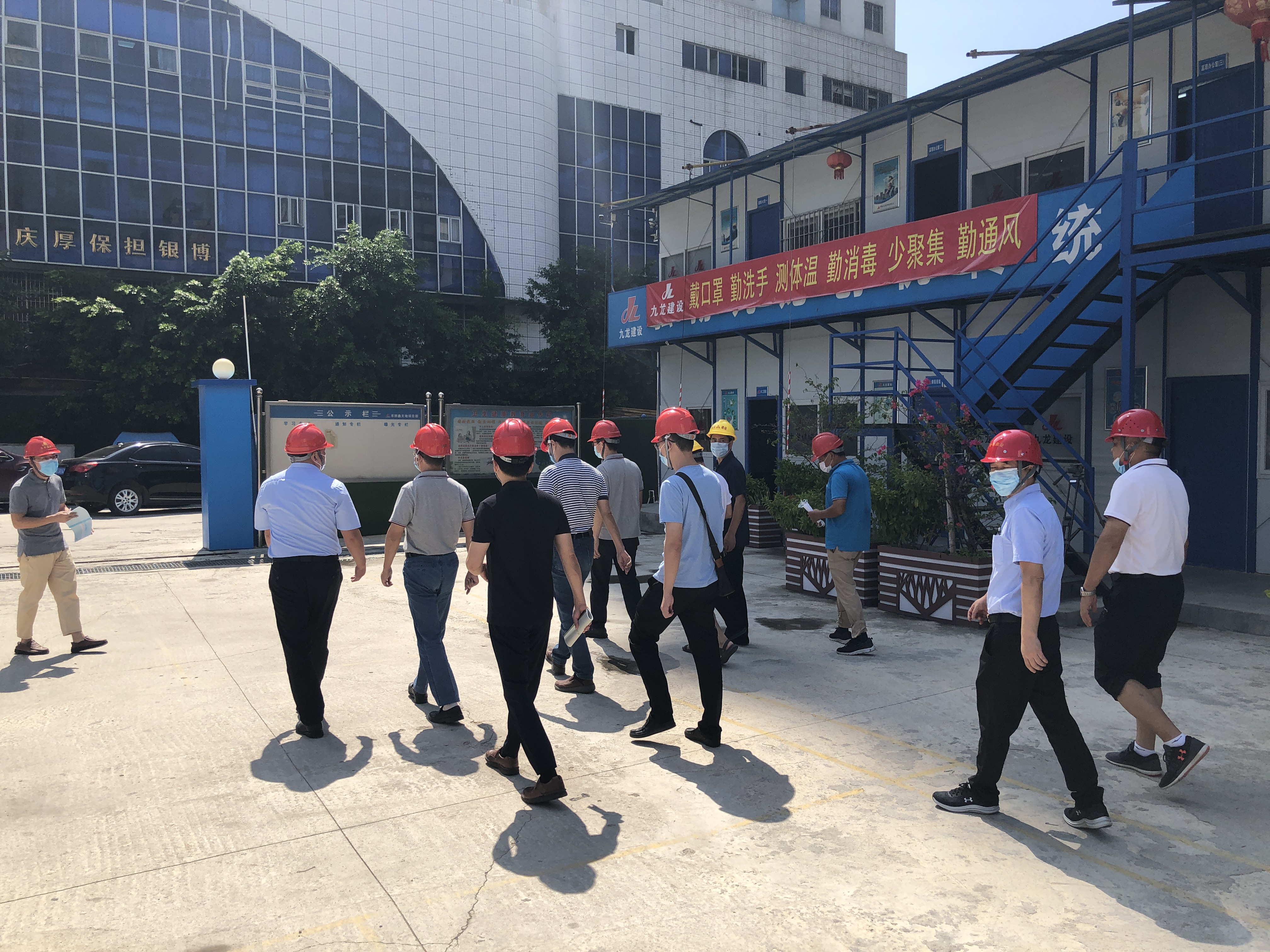 市建设局、质安站几位领导在项目部相关负责人的陪同下,亲自下现场检查,查看了大型机具、防护装置设施、配电箱、安全警示标志、作业人员安全防护工具、现阶段疫情防控举措等项目安全工作的落实情况,同时指出要继续盯紧安全管理和生产职责,加强施工现场安全隐患排查。